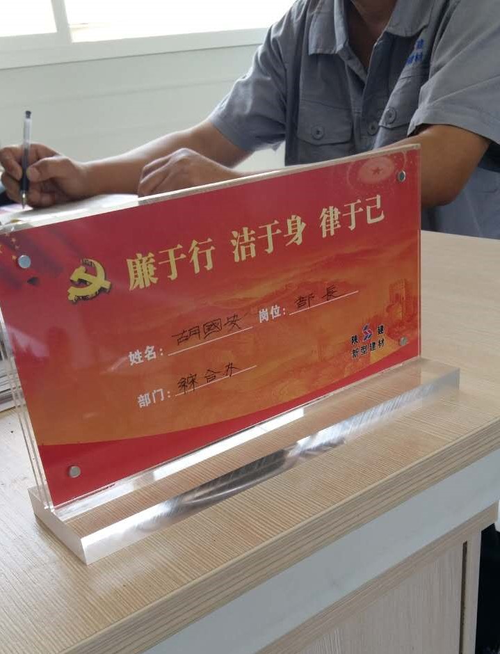 日前,陜建新型建材有限公司在學(xué)習(xí)貫徹《中國共產(chǎn)黨廉潔自律準(zhǔn)則》和《中國共產(chǎn)黨紀(jì)律處分條例》中,開拓思路、創(chuàng)新形式,為黨員領(lǐng)導(dǎo)干部制發(fā)了廉潔自律警示桌牌。 廉潔桌牌正面印有“廉于行,潔于身,律于己”警句及姓名、崗位、部門;背面印有“黨員廉潔自律規(guī)范”。要求全體黨員干部以黨員廉潔自律規(guī)范條款規(guī)定為內(nèi)容,自覺提升思想道德境界,堅持公私分明,先公后私,克己奉公;堅持崇廉拒腐,清白做人,干凈做事;堅持尚儉戒奢,艱苦樸素,勤儉節(jié)約;堅持吃苦在前,享受在后,甘于奉獻。廉政桌牌,彰顯著新型建材濃厚的廉政文化氛圍。